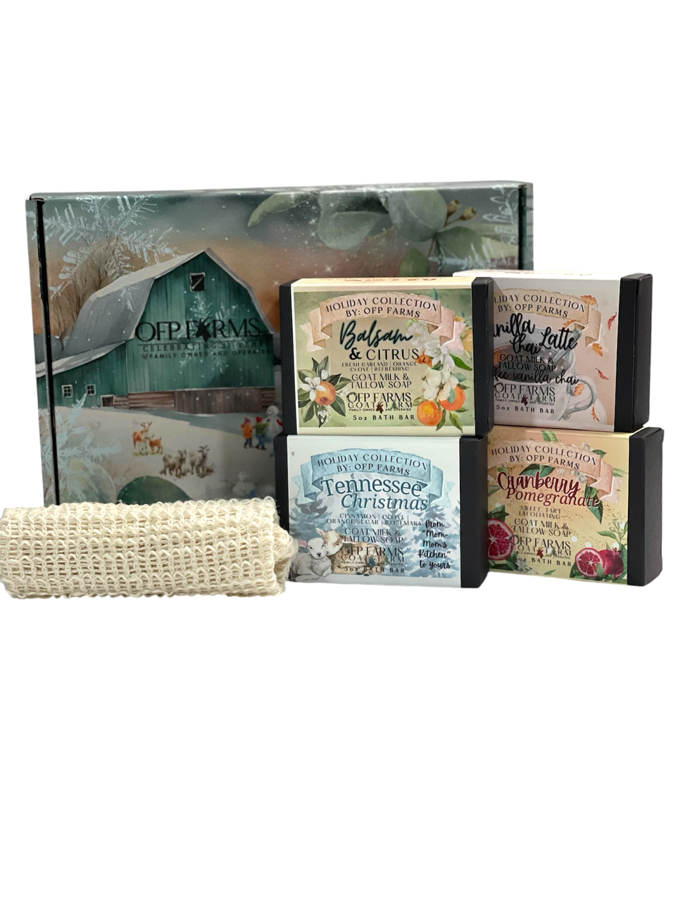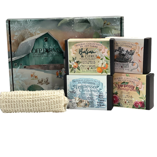 Celebrate the season with our curated Christmas 4 Soap Gift Box—a thoughtfully assembled collection featuring four beloved scents: Balsam and Citrus, Tennessee Christmas, Vanilla Chai, and Cranberry Pomegranate. Each bar combines nourishing goat milk and tallow for luxuriously creamy lathers and skin-loving benefits. Beautifully presented in custom OFP holiday packaging with an included soap sack, this set makes an impressive gift for loved ones or a special treat for yourself.