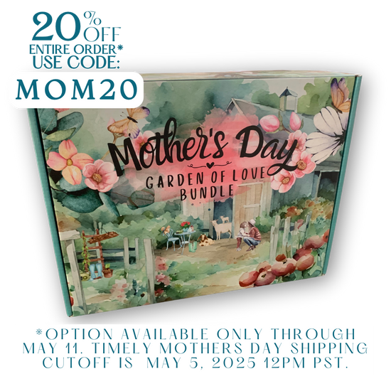 The Mother Day Garden Box - Max Contains: Two 3 oz soap bars, One Goat Milk Lotion, One Goat Kisses Lip Balm, One, One Personal Journal, One Scripture Pen, One 4 oz Candle, One Seed Card, One Book Mark and One Light Weight Cuddly Shawl.